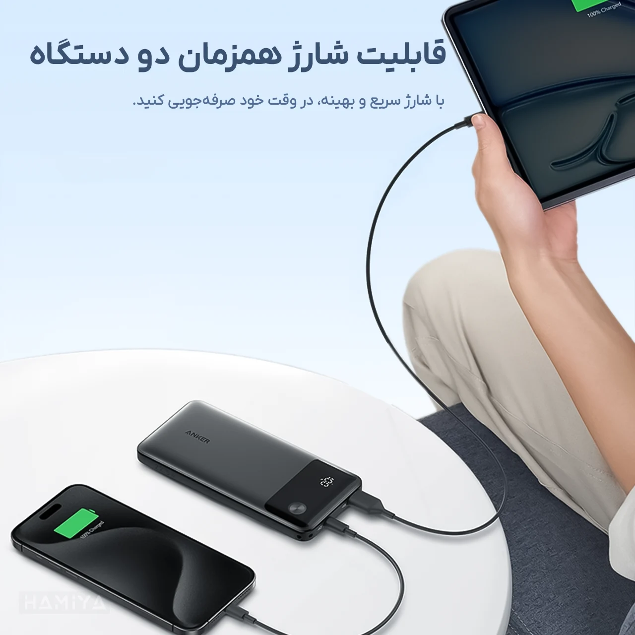 مشخصات پاوربانک انکر مدل A1388 با ظرفیت 10000 میلی آمپر ساعت، کابل تایپ سی به تایپ سی و توان 22.5 وات
